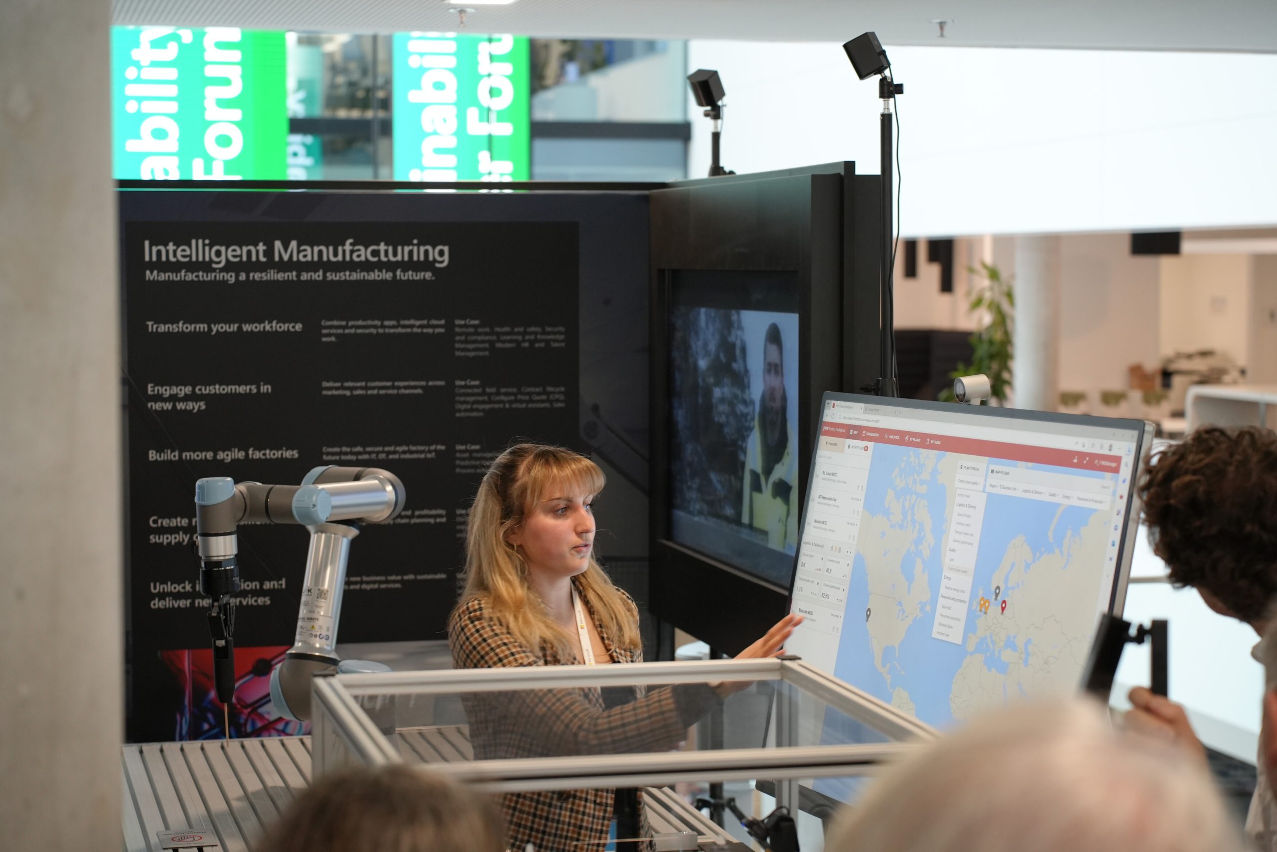 Nach dem interaktiven Teil im ersten Stock ging es ins Erdgeschoss, in den so-genannten „Hive“. Unser Gastgeber Bern Vellguth begrüßte uns bei Microsoft und erläuterte uns die tolle Technologie, in der wir uns befinden durften. Der Hive ist ein hybrider Meetingraum, bei dem die virtuellen remote Teilnehmer physikalisch mit dem Raum interagieren können. So können sie sich sichtbar zu Wort melden, ihr social Feedback wird mit einem Emoji Barometer angezeigt, und sprechende Remote Teilnehmer werden automatisch neben dem Sprecher im Saal auf einem vertikal aufgehängten Monitor für die Saalteilnehmer angezeigt. Durch die Technologie des Raumes konnten unsere fernen Teilnehmer wunderbar partizipieren.