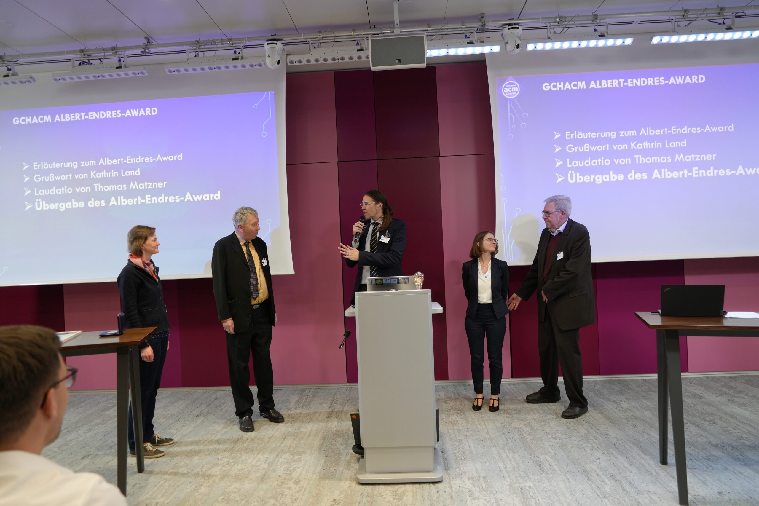 Zu Ehren unseres leider im letzten Jahr verstorbenen Gründungsvaters Albert Endres wurde vom Vorstand unter der maßgeblichen Ägide unseres Chairman Ernst Oliver Wilhelm der Albert Endres Award ins Leben gerufen. Der Award ehrt für die Verdienste für die Informatik im Allgemeinen und Engagement für das German Chapter of the ACM im Besonderen. Die Aktivitäten um den Award wurden geleitet von Daniela Dahmke, die den Preis erläuterte. Die Jury des Awards bestand in diesem Jahr aus Daniela Damke, Thomas Matzner, Eberhard Schmolz und Ernst-Oliver Wilhelm.